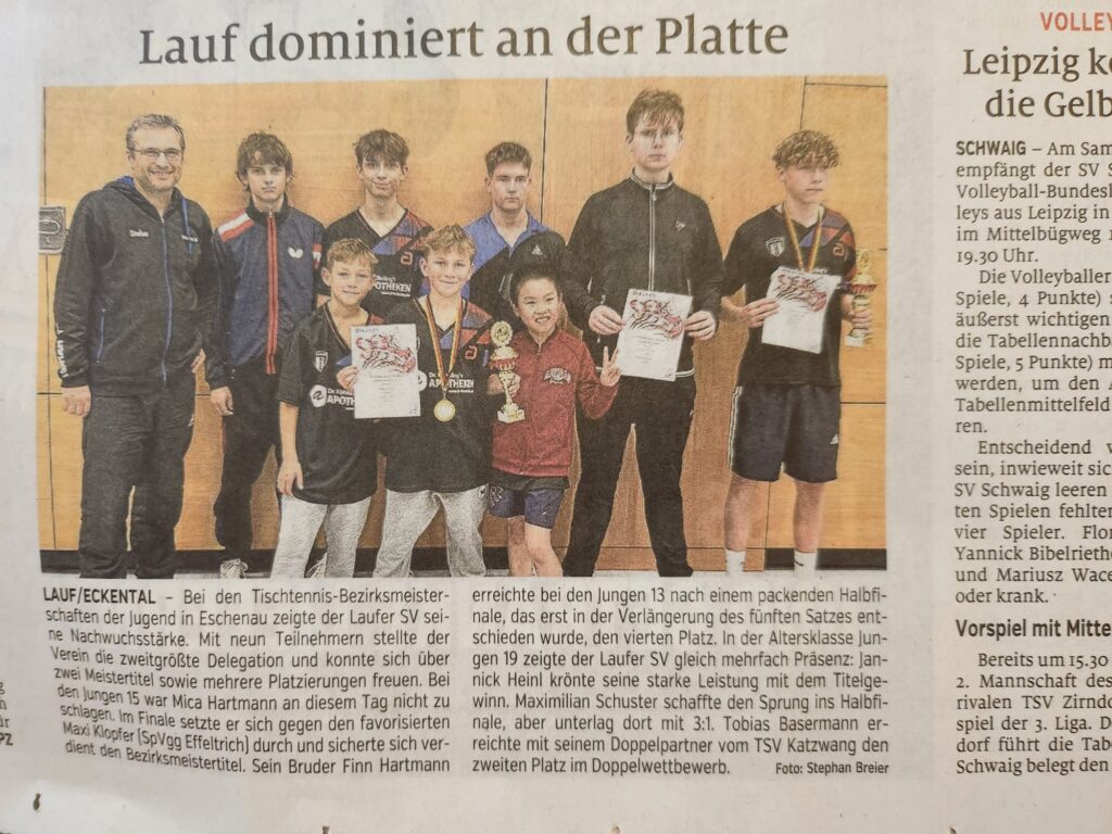 Tischtennis TSV Lauf Tischtennis Ich spiele zur Zeit in der 2. Jugendmannschaft und in der 4. Herrenmannschaft des TSV Lauf Trainingsvideo Schau dir ein Trainingsspiel von mir an Mannschaftspiel am 03.11.24 Wir haben gegen Eschenau 6:4 gewonnen Bezirksmeisterschaften am 12.10.25 Trainieren wir einmal zusammen? Schreib mir